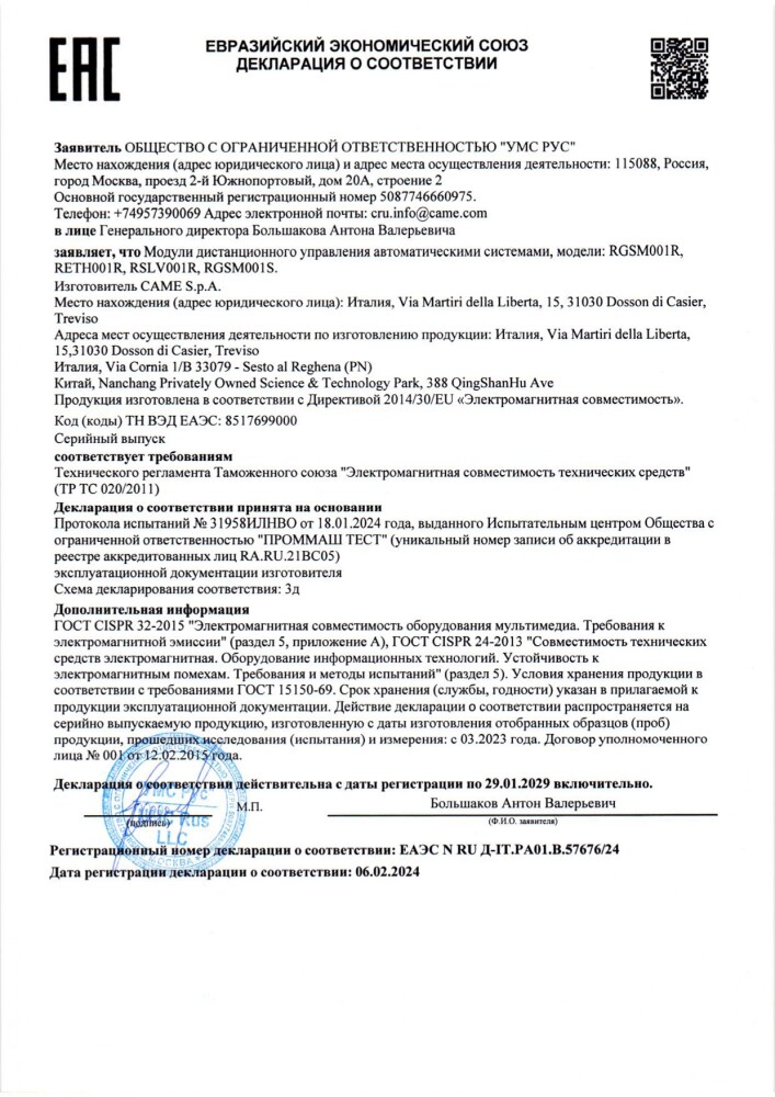 - Управление подключённой автоматикой из любой точки мира через приложение CAME AUTOMATION или браузер